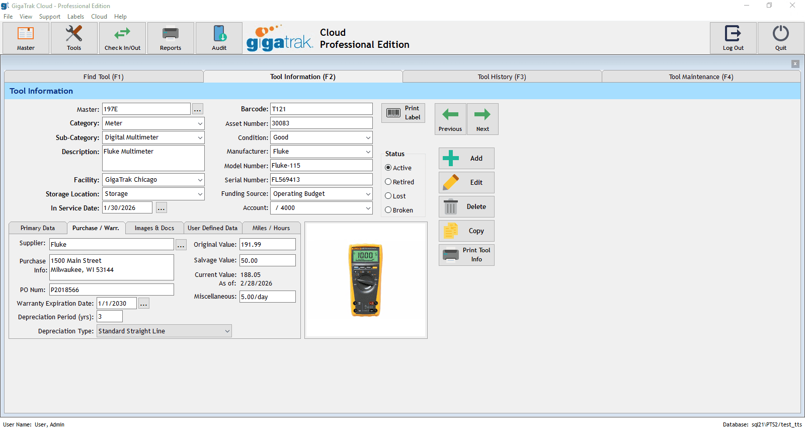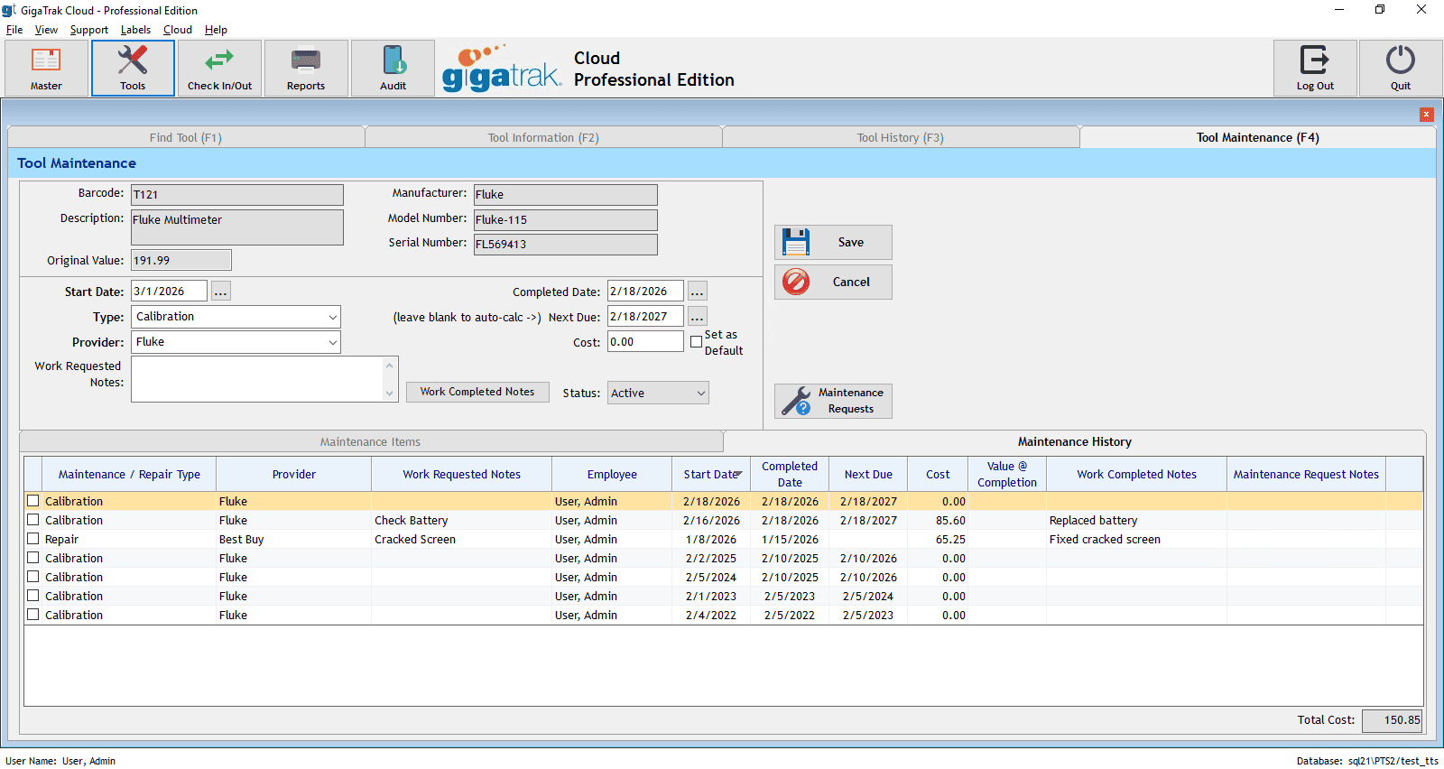 GigaTrak’s Tool Tracking System (TTS) Professional Edition expands upon the Basic Edition functions with abilities to track tool maintenance. Pro Edition also allows for the creation of user-defined fields based on class and type of tool. In addition, users can filter on overdue assets and generate various maintenance reports for their records.